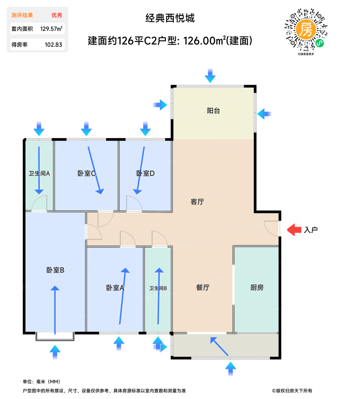 在售建面约126平C2户型 | 建面:126㎡ | 朝向: