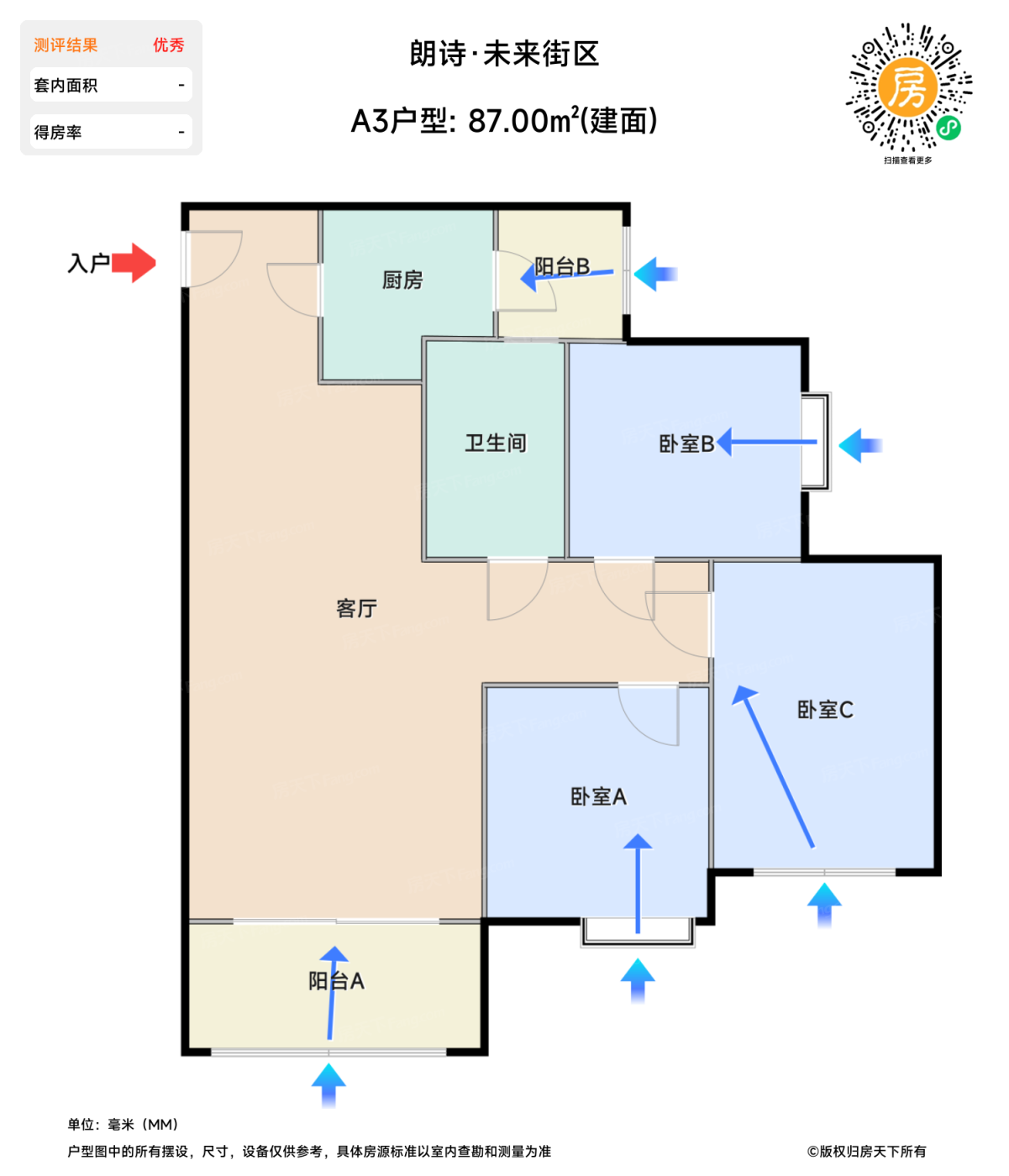 在售A3户型 | 建面:87㎡ | 朝向:南北
