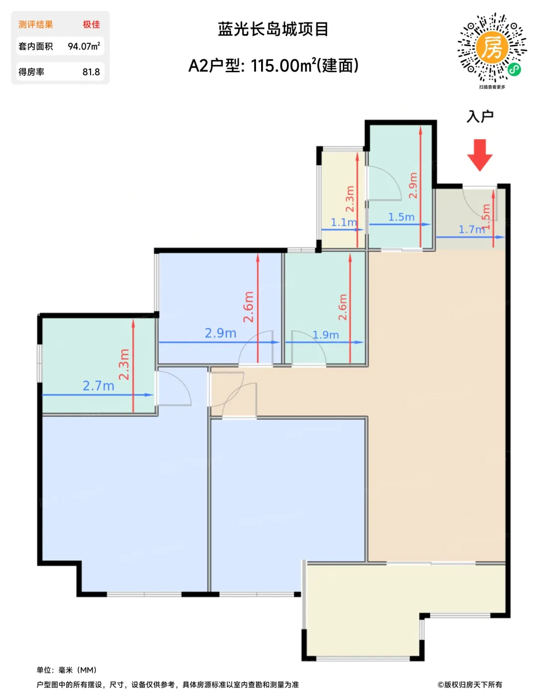 | 卧室C | 7.6 | 2.9 | 2.6 | 良好 |