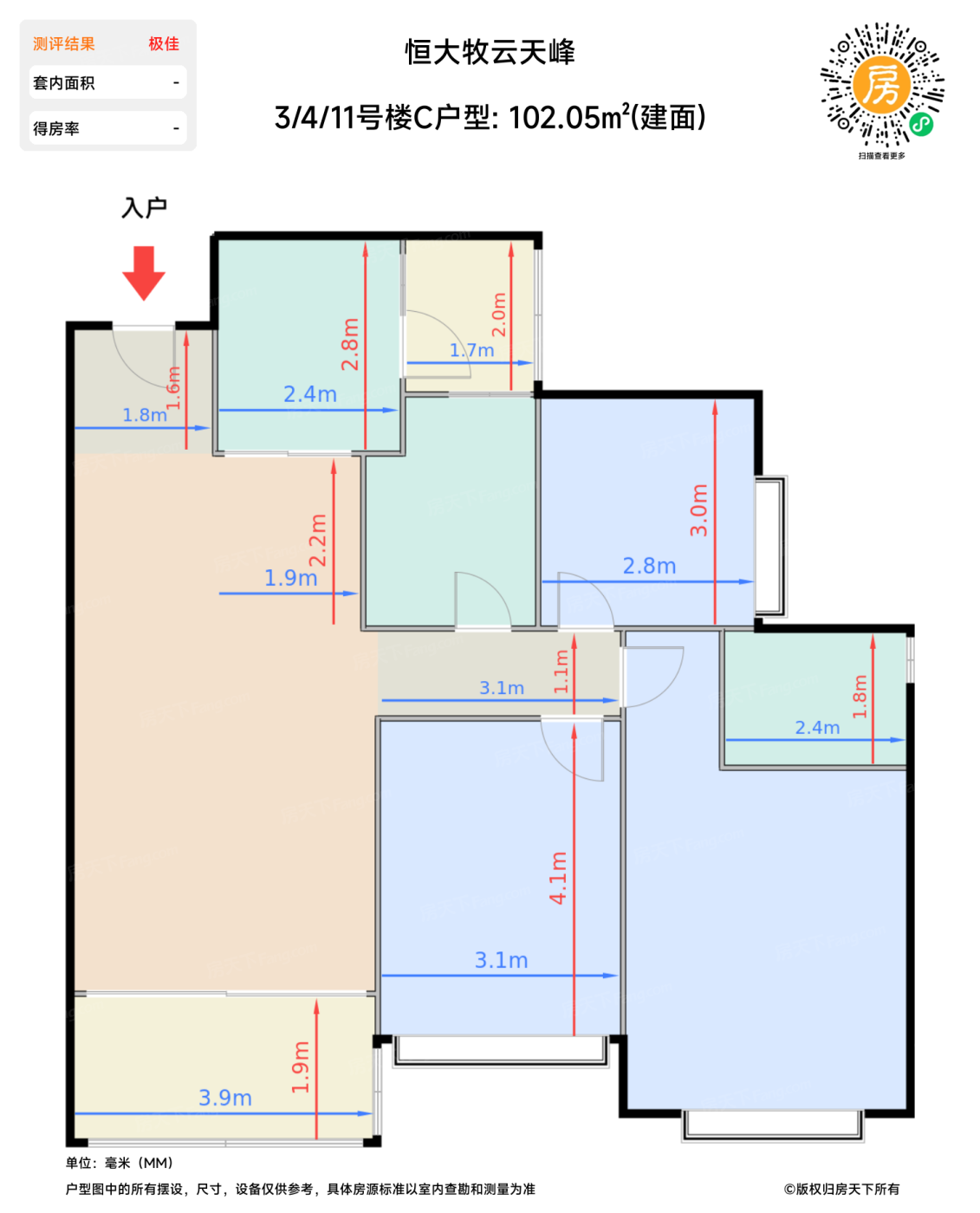 | 卧室C | 12.8 | 3.1 | 4.1 | 良好 |