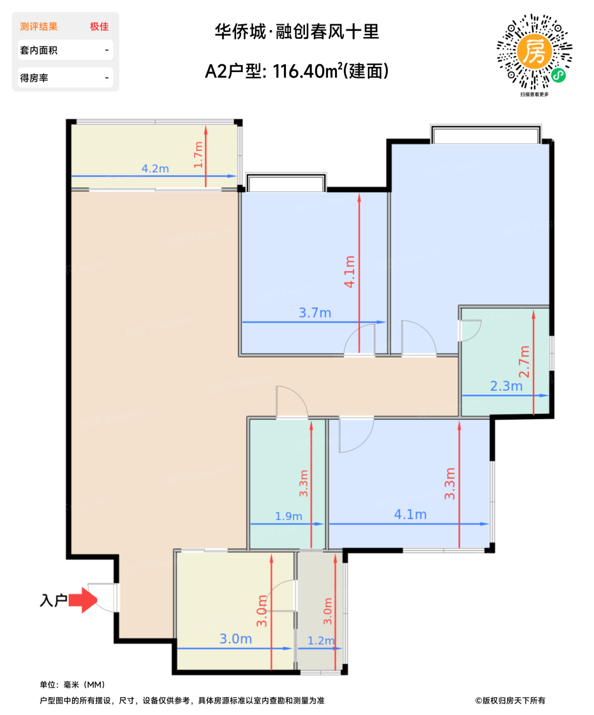 | 卧室C | 13.3 | 4.1 | 3.3 | 良好 |