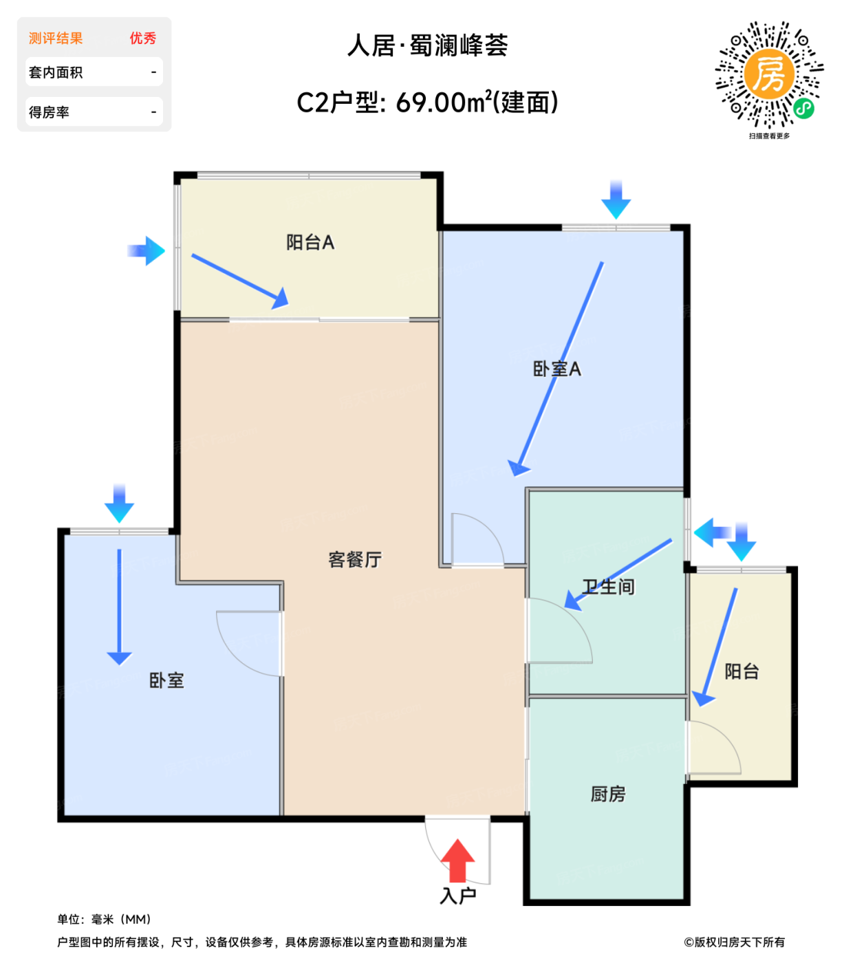 在售C2户型 | 建面:69㎡ | 朝向:东南,西北