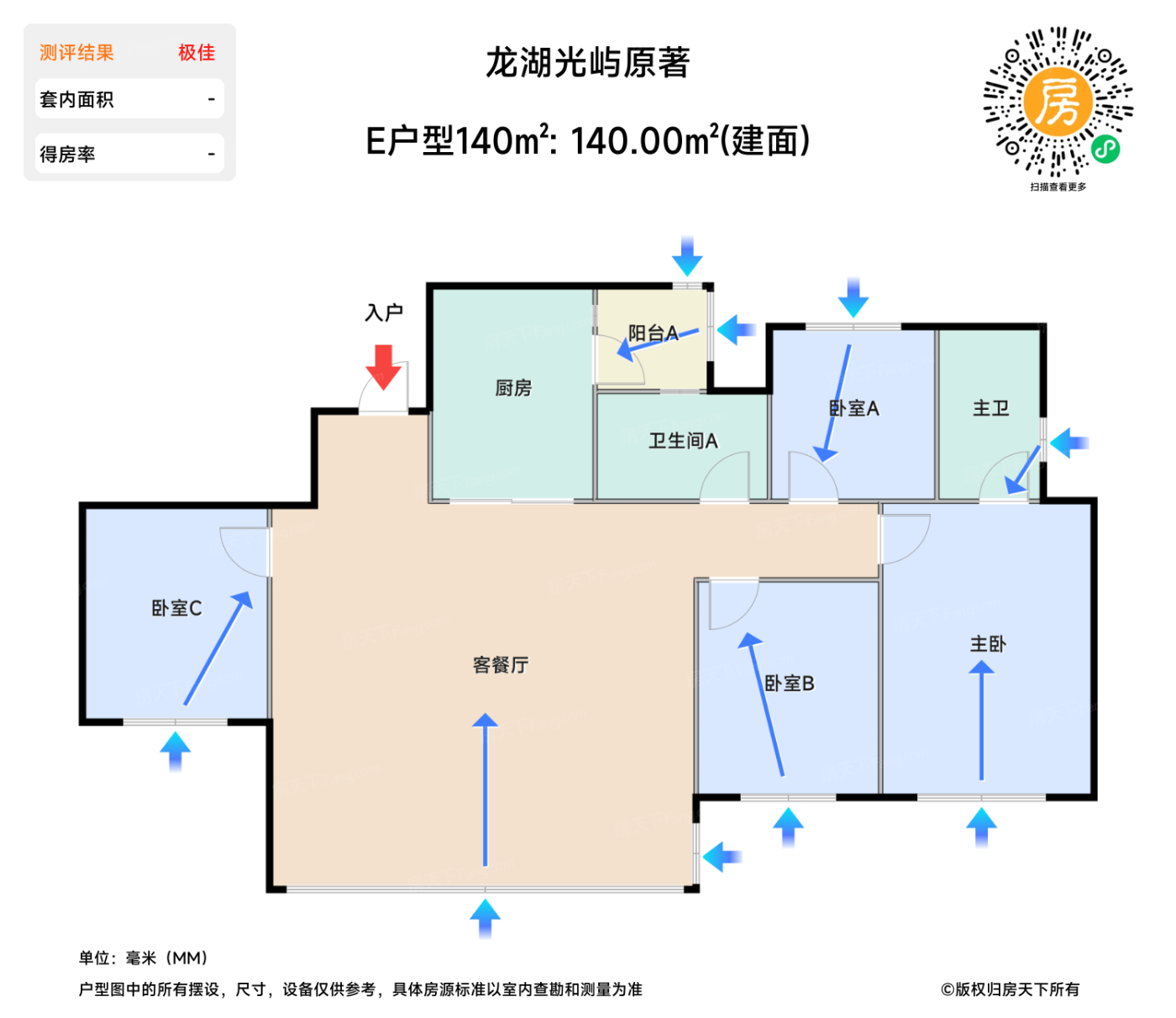 在售E户型140㎡ | 建面:140㎡ | 朝向:西北,南北