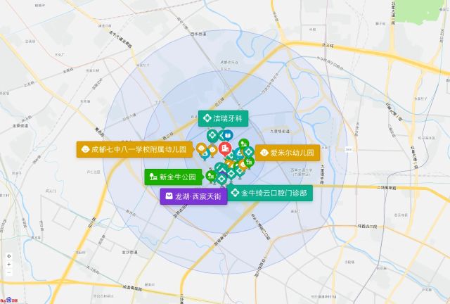 直线3km范围内有81个幼儿园。直线3km范围内有27个小学,如成都七中八一学校小学部、成都市茶店子小学校南区、成都市实验小学战旗分校、成都市石笋街小学校(西区)、锦西外国语实验小学等。直线3km范围内有14个中学,如成都市第二十中学校高中部、西南交通大学附属中学、成都市实验外国语学校、成都十八中主校区、成都市石室联合中学(西区)等。