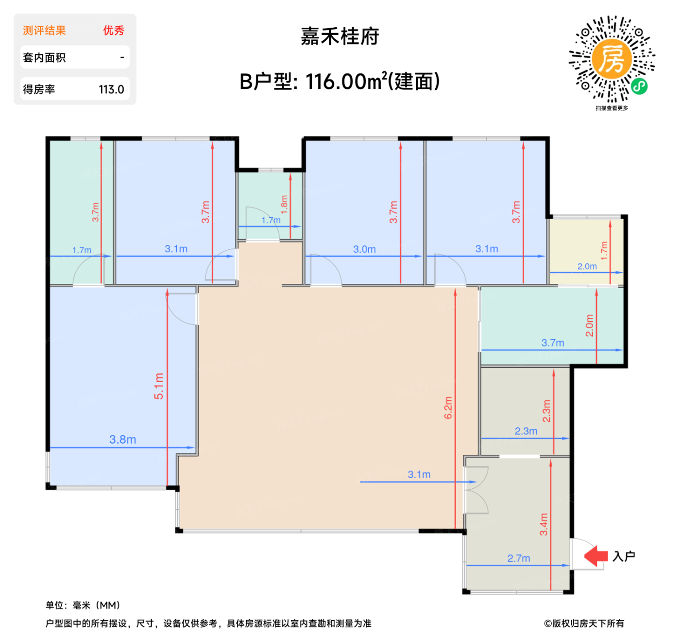 | 卧室B | 11.5 | 3.1 | 3.7 | 良好 |