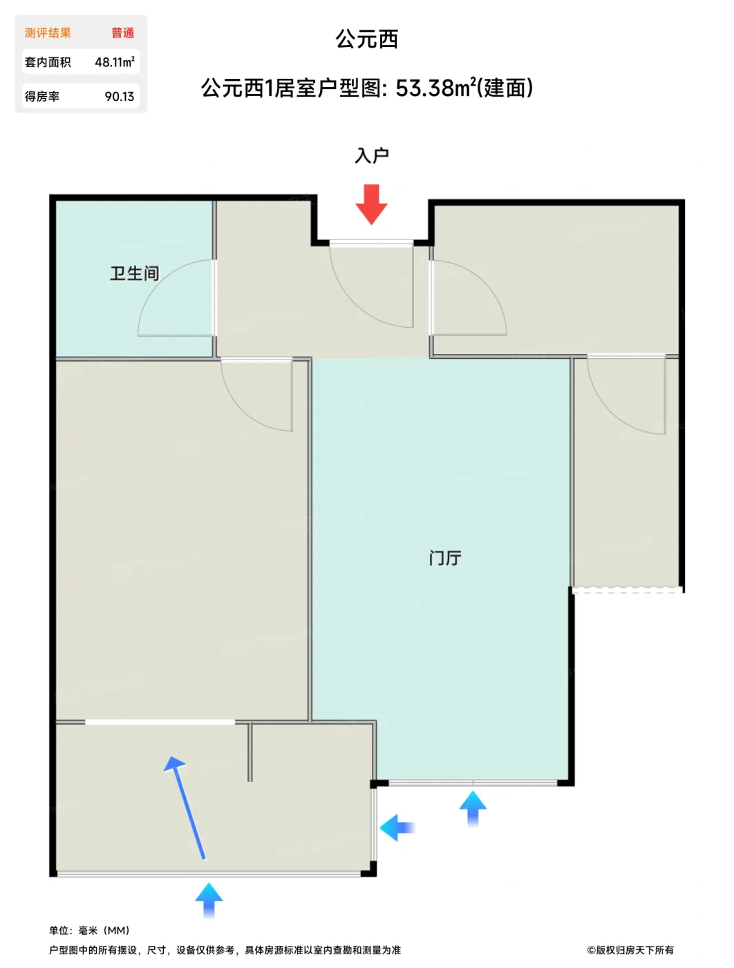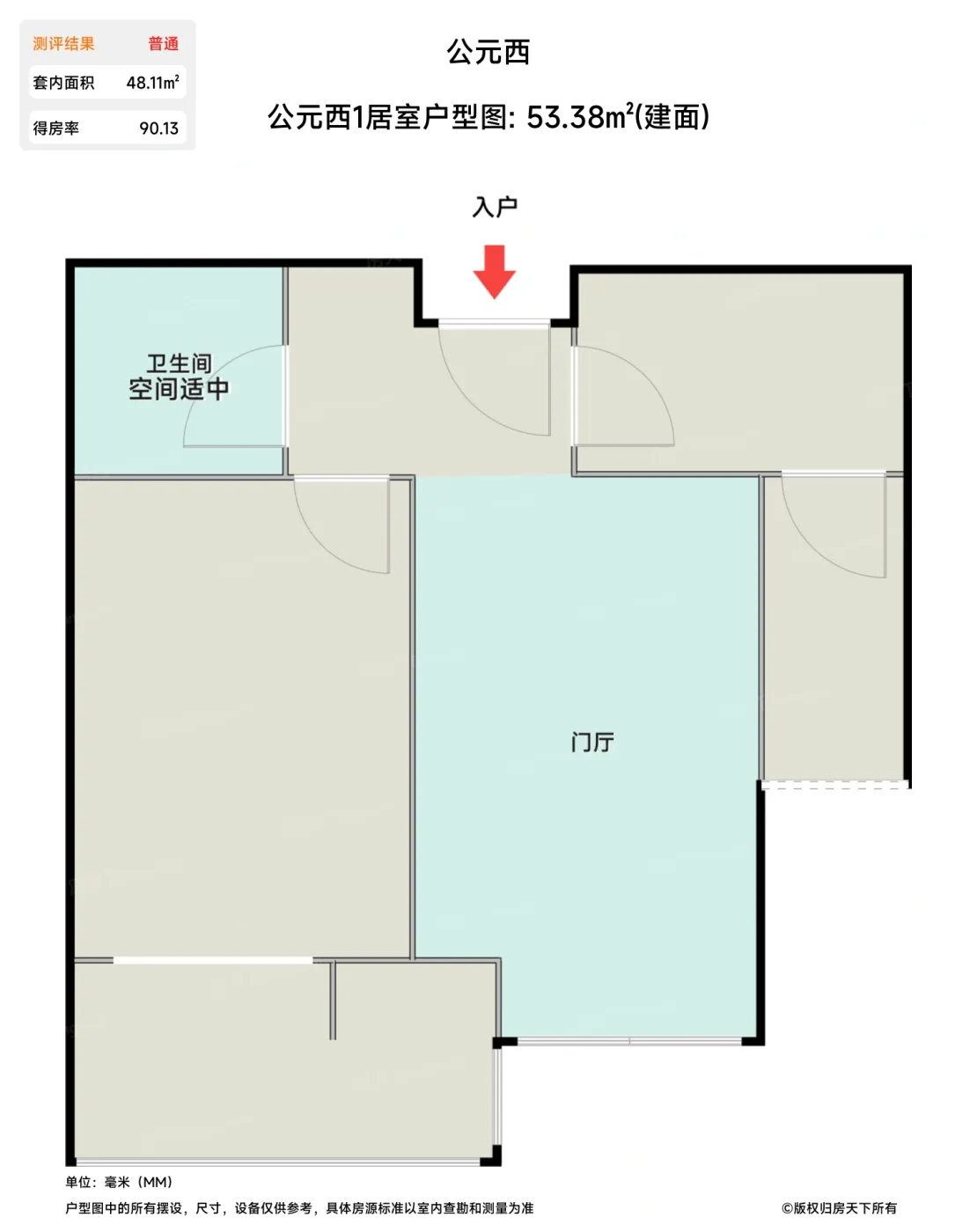 售完公元西1居室户型图 | 建面:53.38㎡ | 朝向:东南