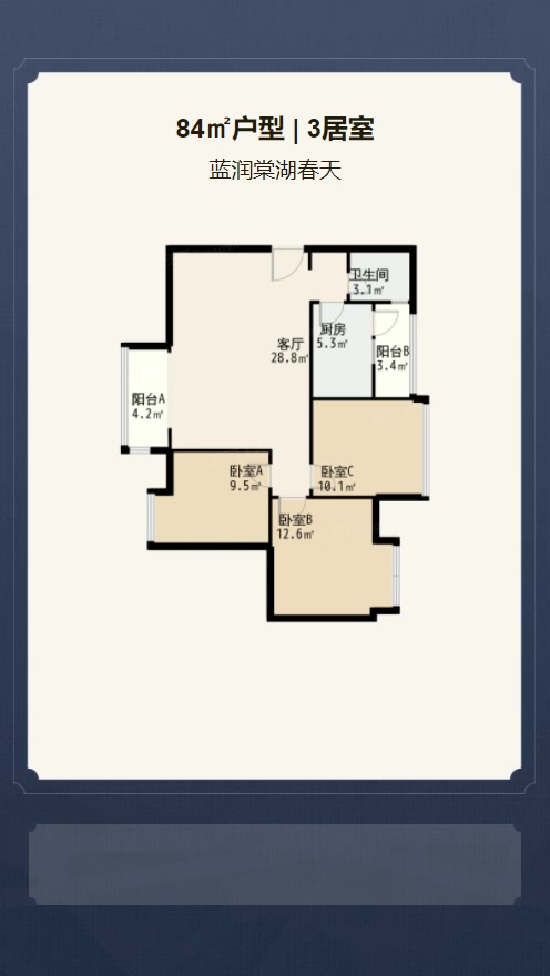 售完蓝润棠湖春天3居室户型图 | 建面:84.4㎡ | 朝向:朝西