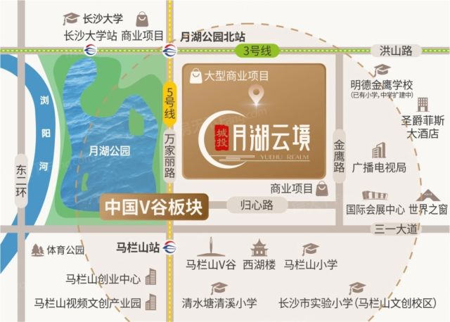 周边直线3km范围内有8个地铁站(月湖公园北、长沙大学、马栏山、白茅铺、鸭子铺、湘龙、雅雀湖、土桥),轨道交通发达,距离最近的地铁站是月湖公园北。周边直线1km内有8个公交站周边公共交通较为便捷。