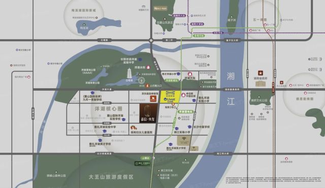 楼盘直线3km范围内有1个一级及以上医院。其中湖南妇女儿童医院距离楼盘361m,为医疗需求提供了保障。楼盘周边3km范围内有7个商场,包括Livat荟聚、龙湖长沙洋湖天街、南柏童方城(洋湖店)、洋湖兰亭MALL等购物中心,商业配套成熟,完全可以满足日常购物需求。楼盘周边生态环境优越,周边3km范围内有23个公园,距离最近的仅592m,非常方便日常休闲使用。