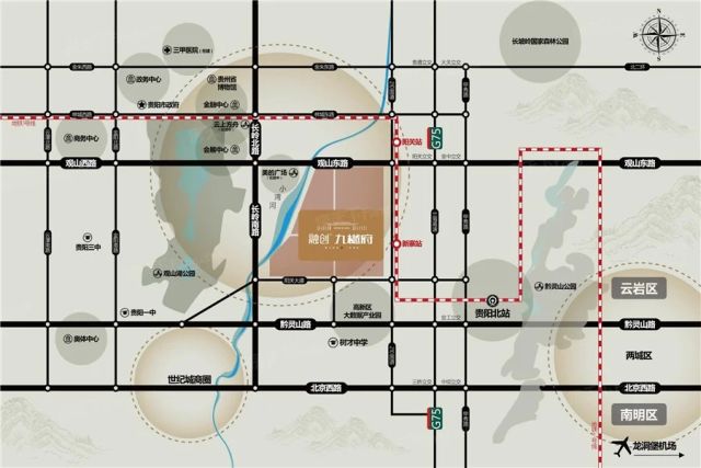 周边直线3km范围内有6个地铁站(新寨、阳关、国际生态会议中心、白鹭湖、观山湖公园、贵阳北站),轨道交通发达,距离最近的地铁站是新寨。周边直线1km内有12个公交站,距离最近的新阳关站仅有333m,周边公共交通极为便捷。