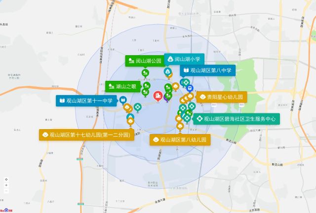 直线3km范围内有61个幼儿园。直线3km范围内有14个小学,如世纪城小学理想城分校、中天北京小学、贵阳市师范学校附属实验小学西校区、观山湖区第十一小学、阅山湖小学等。直线3km范围内有10个中学,如贵阳市第一中学、观山湖区第八中学、观山湖区第十一中学、贵阳市第三中学、观山湖区华润中学等。