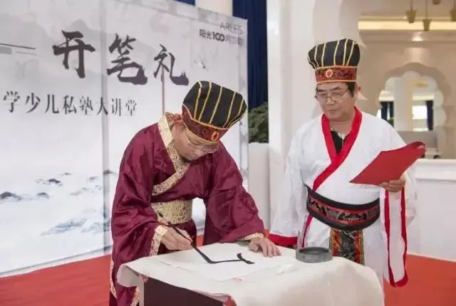 开天眼:“举臆发朱砂,为瑞应火德”,由老师在孩子的额头正中点上红痣,这称之为“开天眼”“痣”通“智”,意为开启智慧,以此寄托美好的愿望,寓意着孩子从此眼明心明,好读书,读好书。