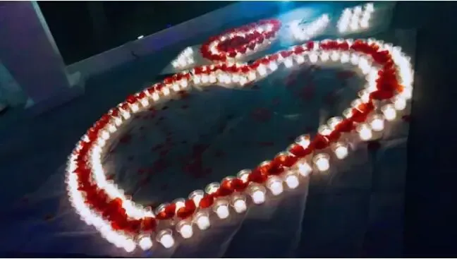 小伙用蜡烛和花瓣摆成心的形状
