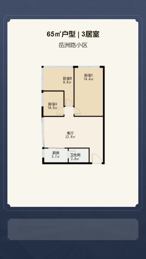 售完岳洲路3居室户型图 | 建面:65.15㎡ | 朝向:朝北