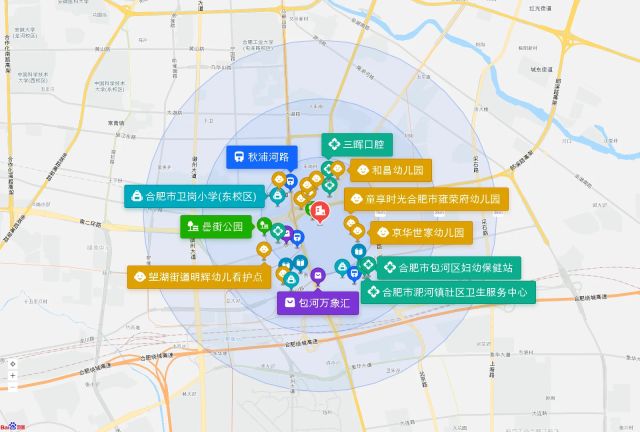 直线3km范围内有82个幼儿园。直线3km范围内有20个小学,如合肥实验学校(包河苑校区)、葛大店小学、合肥市卫岗小学(东校区)、合肥市望湖小学、葛大店小学(南校区)等。直线3km范围内有11个中学,如中国科学技术大学附属中学(高中部)、合肥市第四十八中学(望湖校区)、合肥市第二十九中学、合肥市第四十八中学(祁门路校区)、合肥市第六十五中学等。