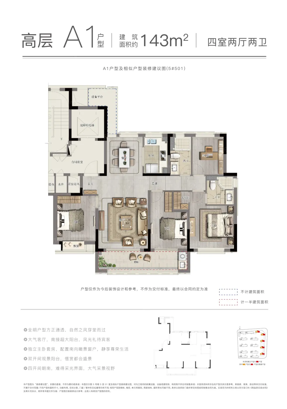 10.0分户型齐全,主打南北通透,全明格局四居。融创慈澜府户型主要有143.0平-183.0平的南北通透,全明格局的四居和237.0平的全明格局,户型方正的五居