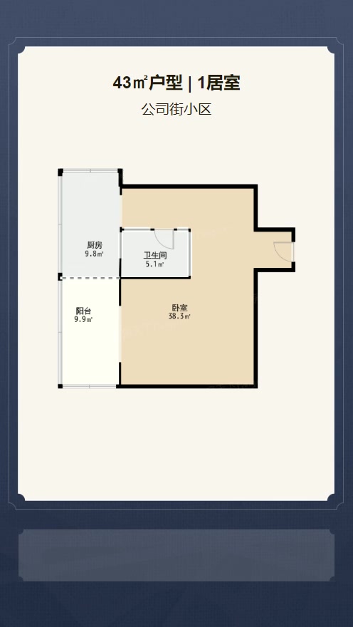 售完公司街小区1居室户型图 | 建面:43.96㎡ | 朝向:朝南