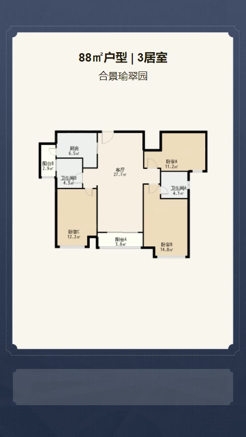 售完合景瑜翠园3居室户型图 | 建面:88.72㎡ | 朝向:朝南