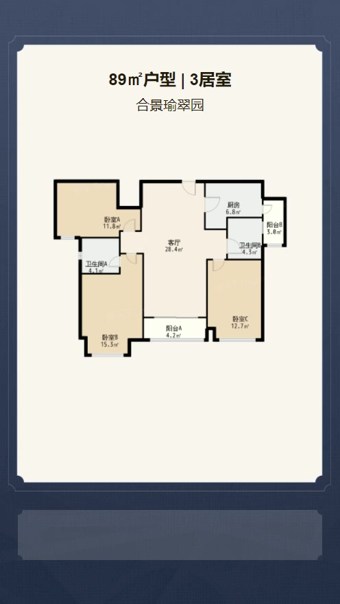 售完合景瑜翠园3居室户型图 | 建面:89㎡ | 朝向:朝南