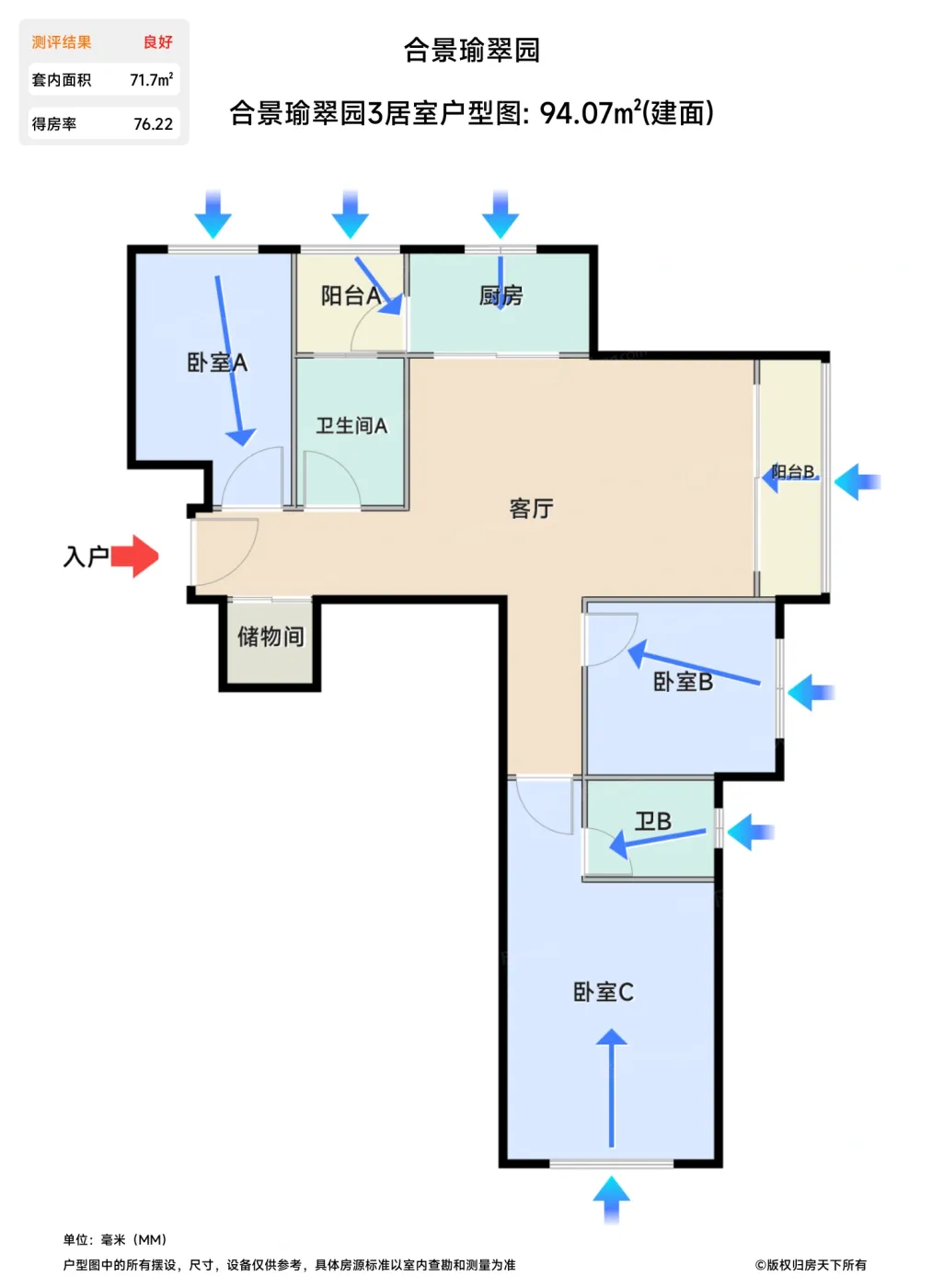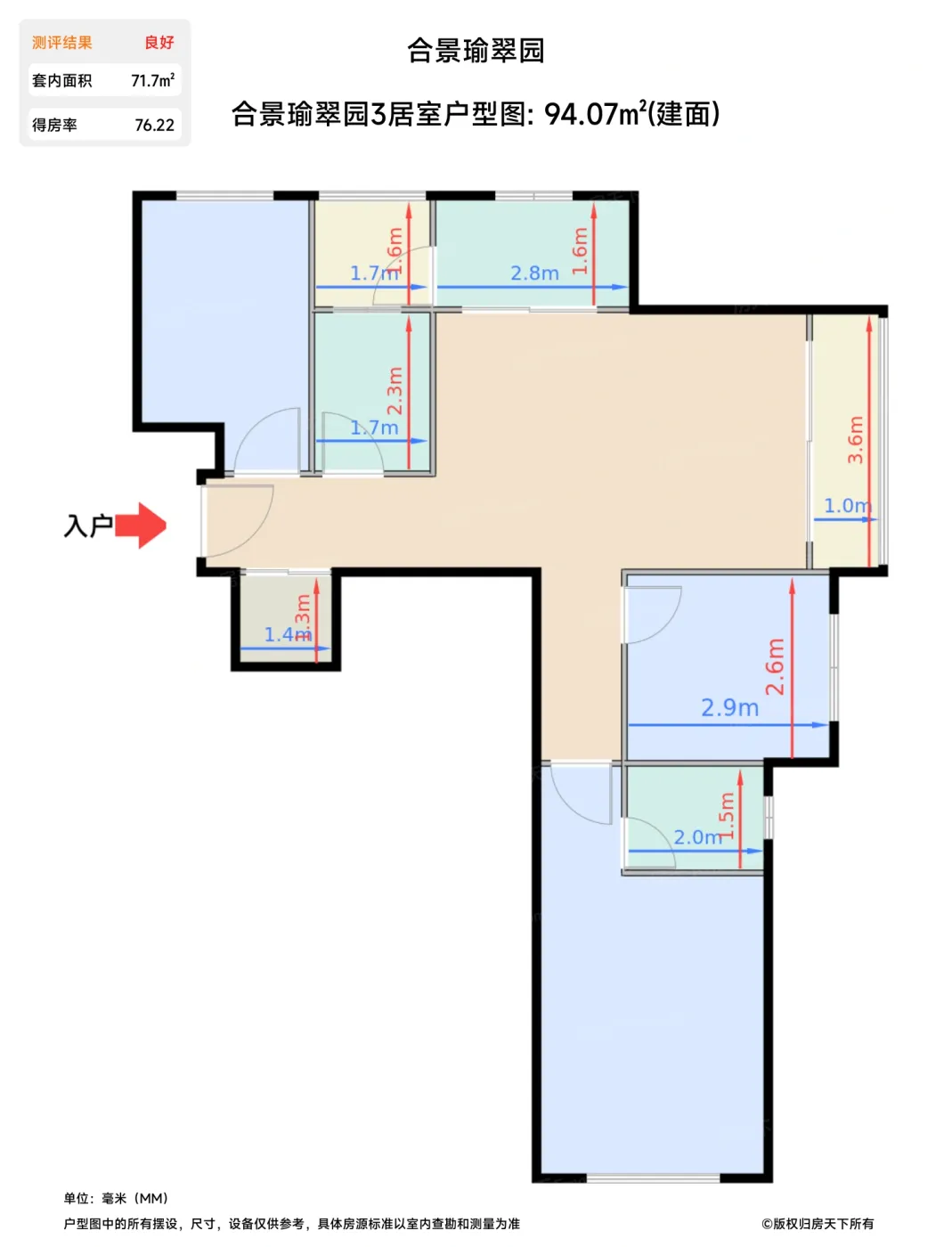 | 卧室B | 7.1 | 2.9 | 2.6 | 良好 |