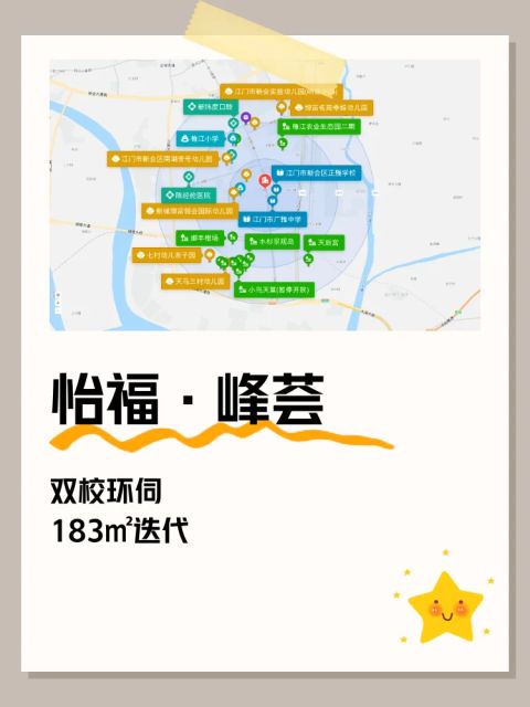 直线3km范围内有20个幼儿园。直线3km范围内有4个小学:梅江小学、天马小学、天禄小学、新会华侨实验小学。直线3km范围内有6个中学,如江门市广雅中学、江门市新会区正雅学校、天马中学、天禄中学、江门市新会区尚雅学校等。