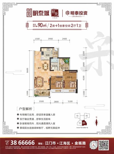 1.85元/平方米 明泰城坐落江海区东海路与金瓯路交汇处,毗邻广珠轻轨江门东站,与江门一中一路之隔,总投资约35亿元,整体定位轻轨旗舰宜居大城。明泰城与江海区政府为邻,路网发达,轻松抵达蓬江中心区、新会城区以及中山古镇,有助于推动江海片区商业发展,打造江海片区不多见的旗舰商业领地;引进名师幼儿园及小学,打造12年一站式教育体系;聘请优异的物管,保证业主居住体验!以高端品质为主导,打造88-160㎡景观洋房,尽享美丽景色。单价 : 11200元/平米