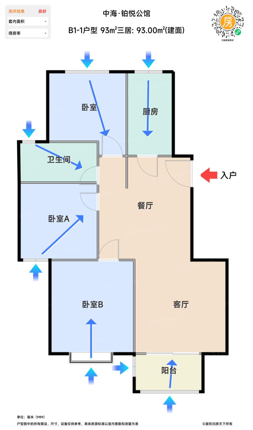 在售B1-1户型 93㎡三居 | 建面:93㎡ | 朝向: