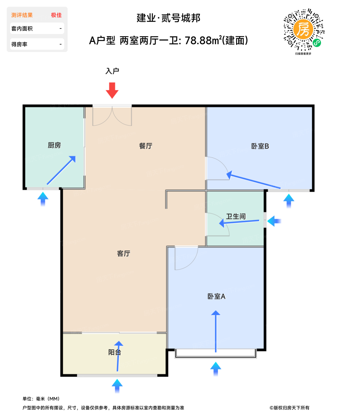 售完A户型 两室两厅一卫 | 建面:78.88㎡ | 朝向:南
