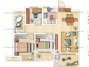 - 空间适中卧室A设计得十分精巧,每一寸空间都得到了合理的利用,既实用又美观,让您在有限的空间里享受无限的舒适。