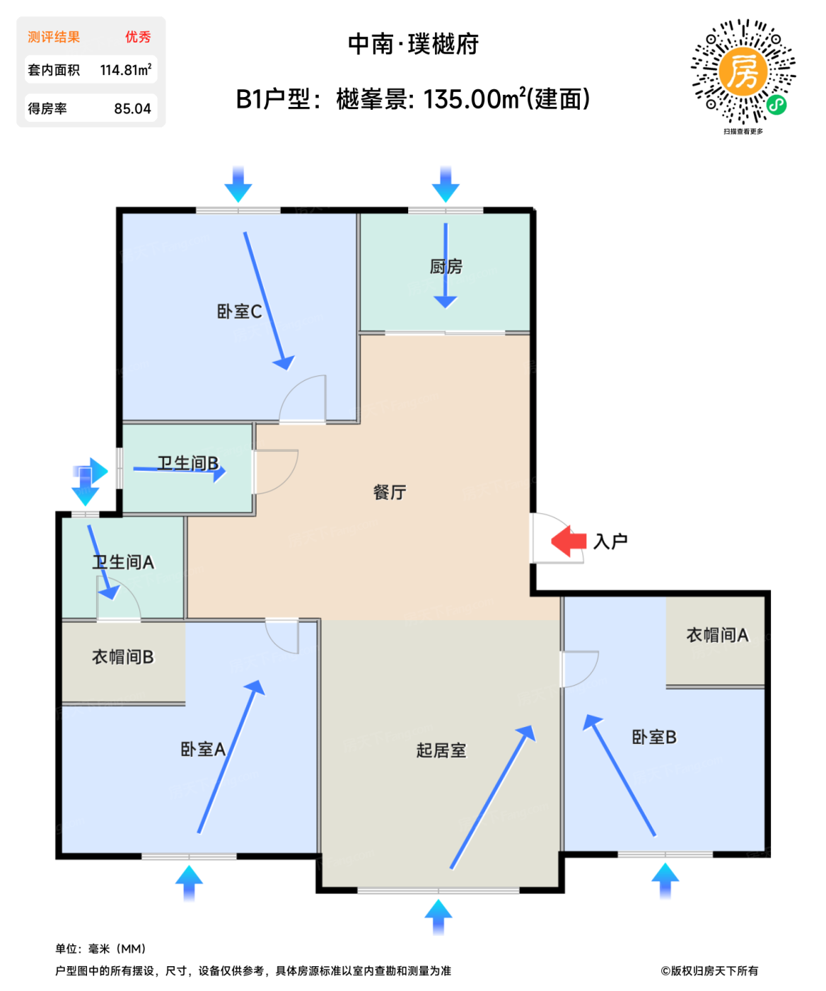 在售B1户型:樾峯景 | 建面:135㎡ | 朝向: