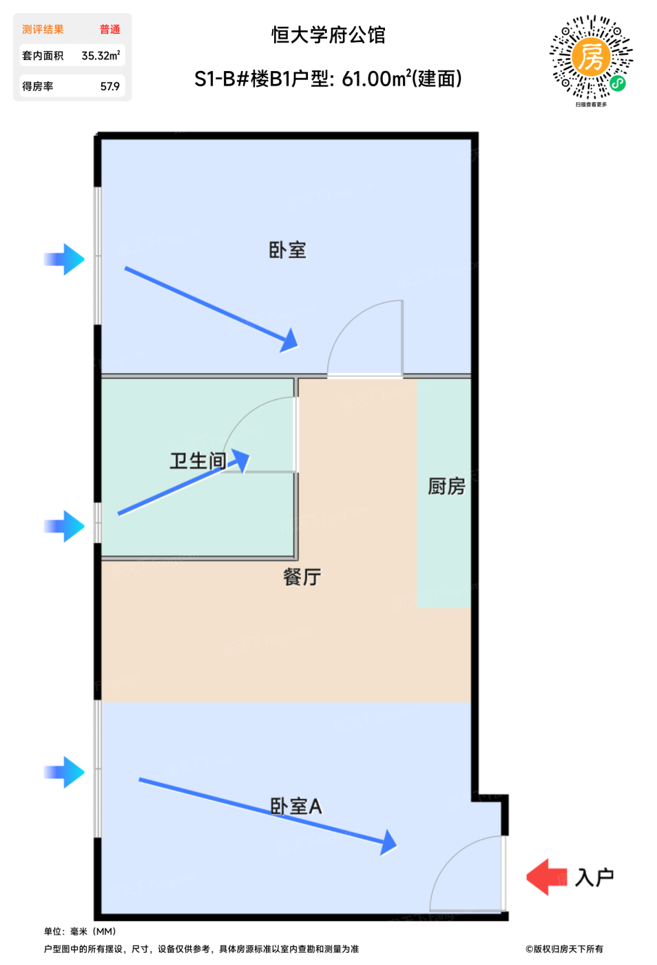在售S1-B#楼B1户型 | 建面:61㎡ | 朝向: