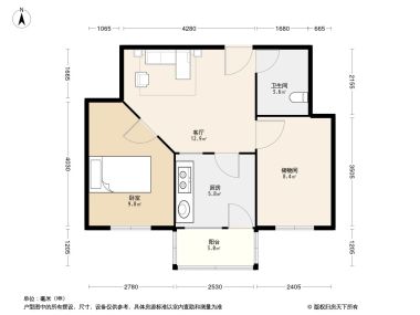 售完友谊北区1居室户型图 | 建面:47㎡ | 朝向:朝南