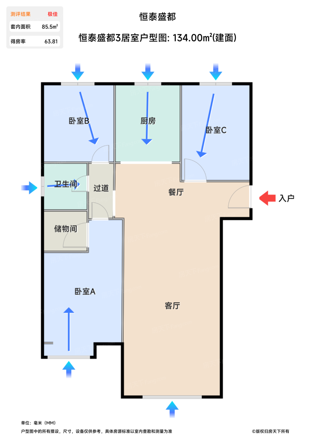 售完恒泰盛都3居室户型图 | 建面:134㎡ | 朝向:南北通透