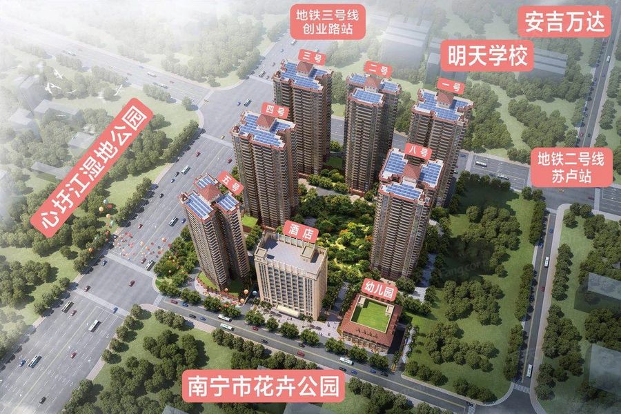 楼盘周边医疗资源较为丰富,直线3km范围内有10个一级及以上医院。其中中国人民武装警察部队广西总队医院距离楼盘2.1km,南宁长江医院距离楼盘2.4km,为医疗需求提供了保障。楼盘周边3km范围内有15个商场,包括万达广场(南宁安吉店)等购物中心,商业配套成熟,完全可以满足日常购物需求。楼盘周边生态环境优越,周边3km范围内有28个公园,距离最近的仅751m,非常方便日常休闲使用。