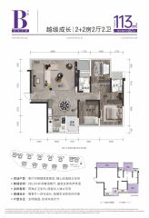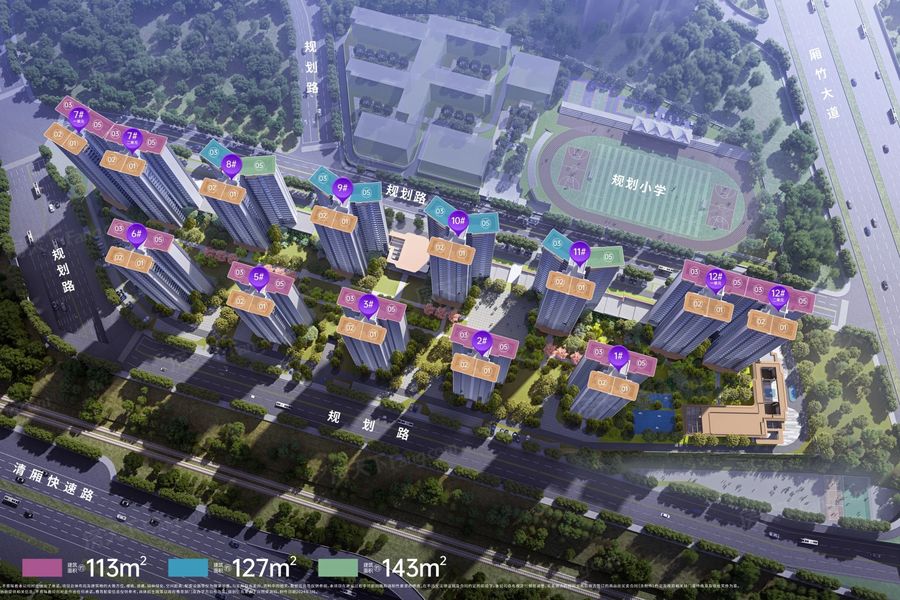 主力户型有113.00㎡(4室2厅0卫),143.00㎡(5室2厅0卫)的容积率有点大,楼栋太密集,看着有点闷。