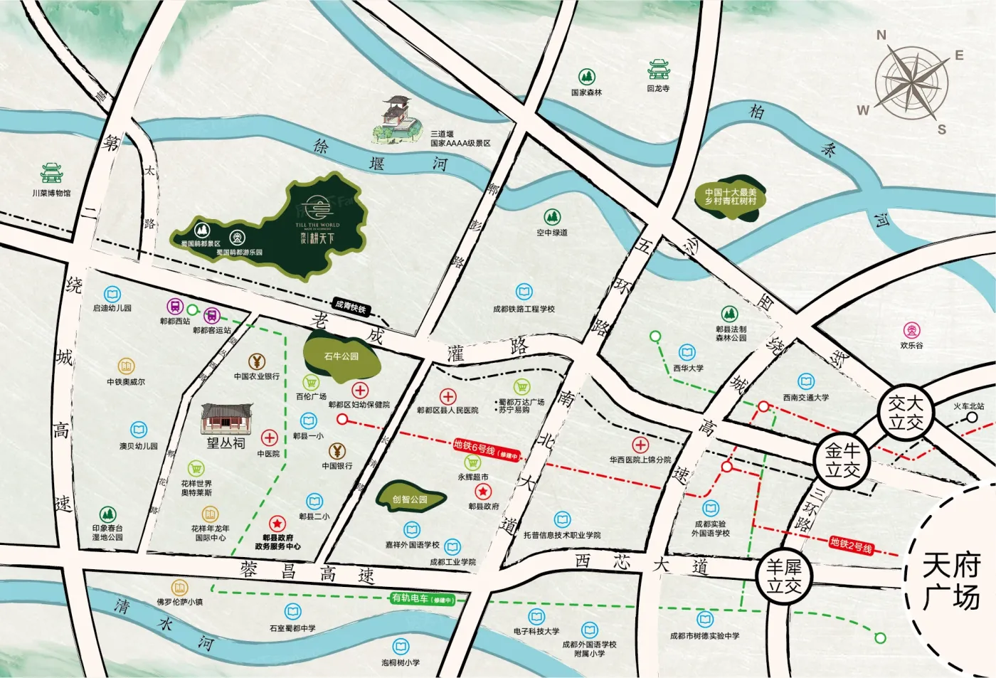 板块内有5个一级以上医院,有3个三甲医院,如成都市郫都区人民医院、成都中医药大学附属第三医院、成都中医药大学教学医院等。