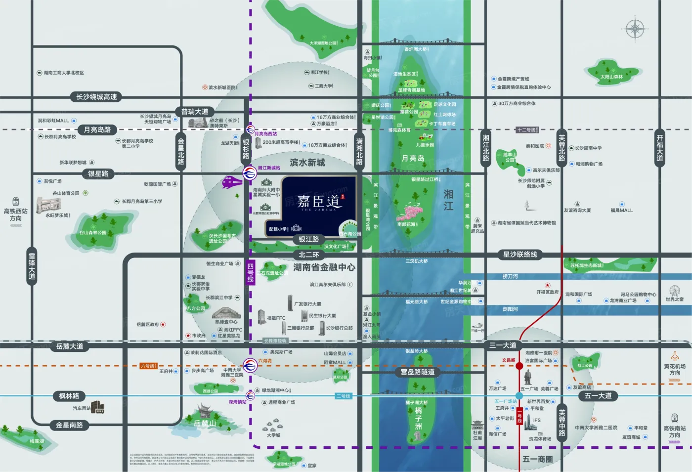 板块内有4个地铁站:如罐子岭地铁、汉王陵公园地铁、湘江新城地铁等;有24个公交站:如潇湘北路普瑞大道口、潇湘北路耳朵湖路口、潇湘北路月亮岛路口等。
