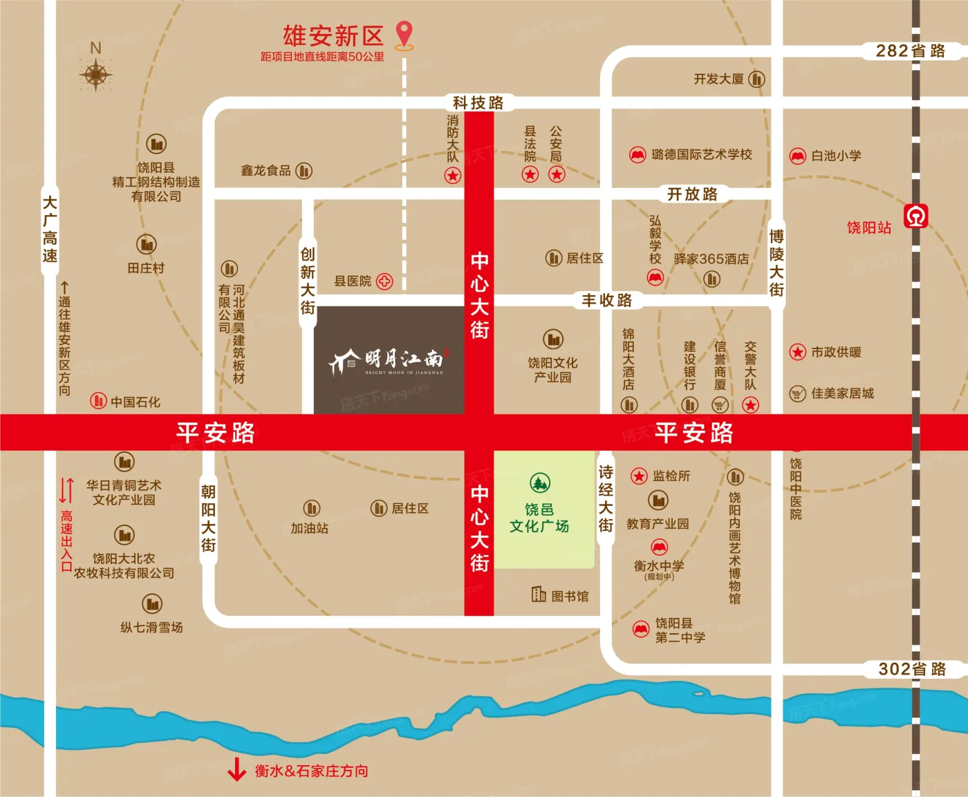 板块生态环境优越,内有6个公园,如诗经文化广场、饶阳县冀中导报纪念馆、沱阳公园。非常方便日常休闲使用。