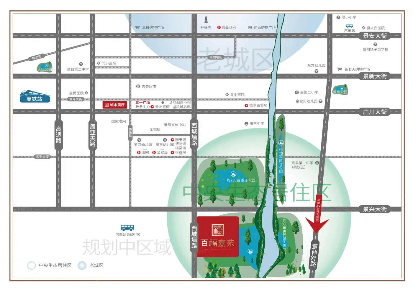 板块生态环境优越,内有21个公园,如周亚夫墓、人民公园、景县天主堂。非常方便日常休闲使用。