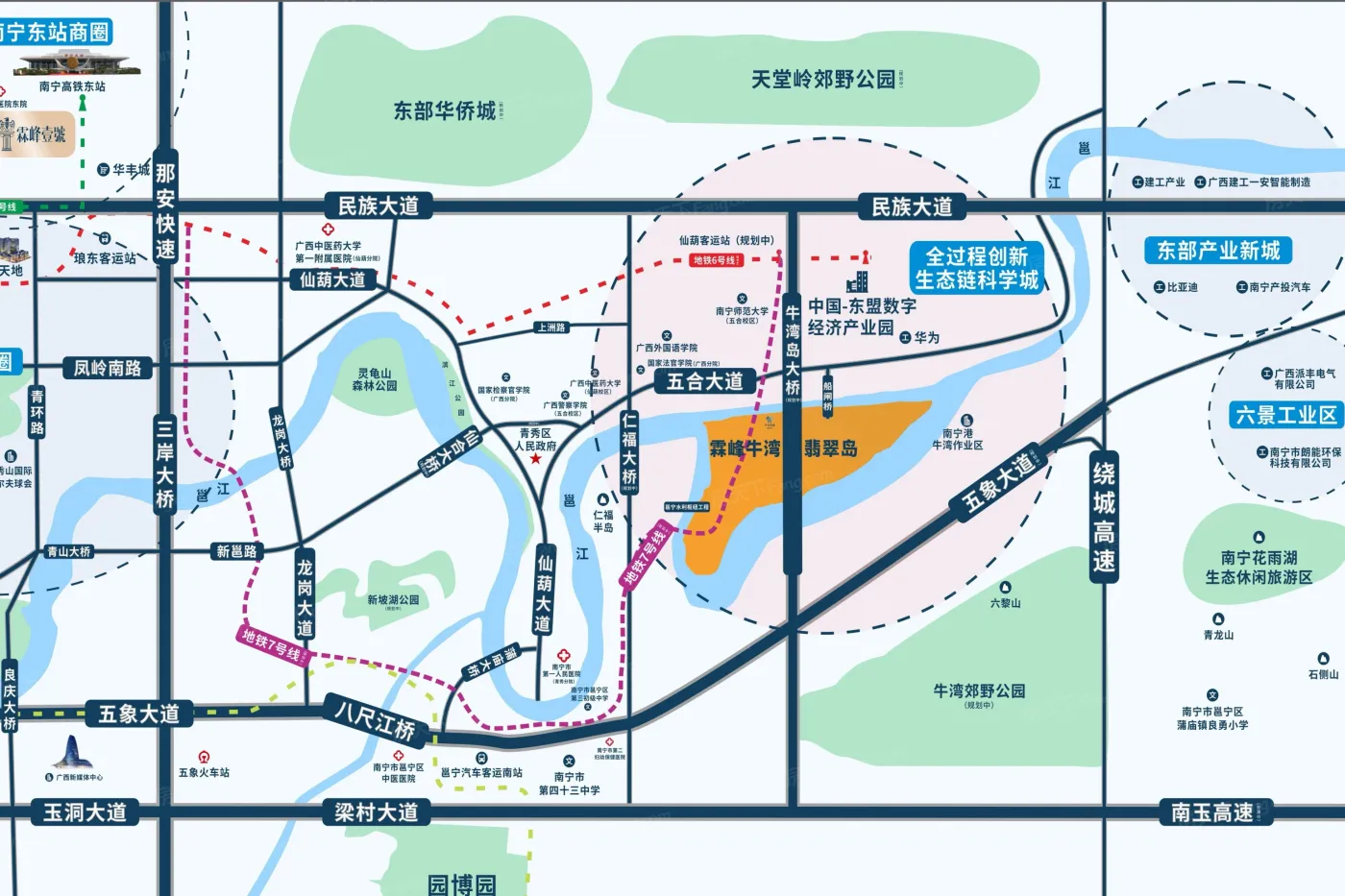 仙葫经济开发区位于南宁青秀,板块内有15个在售楼盘,其中住宅楼盘12个,别墅8个,板块参考均价在13575元/㎡。