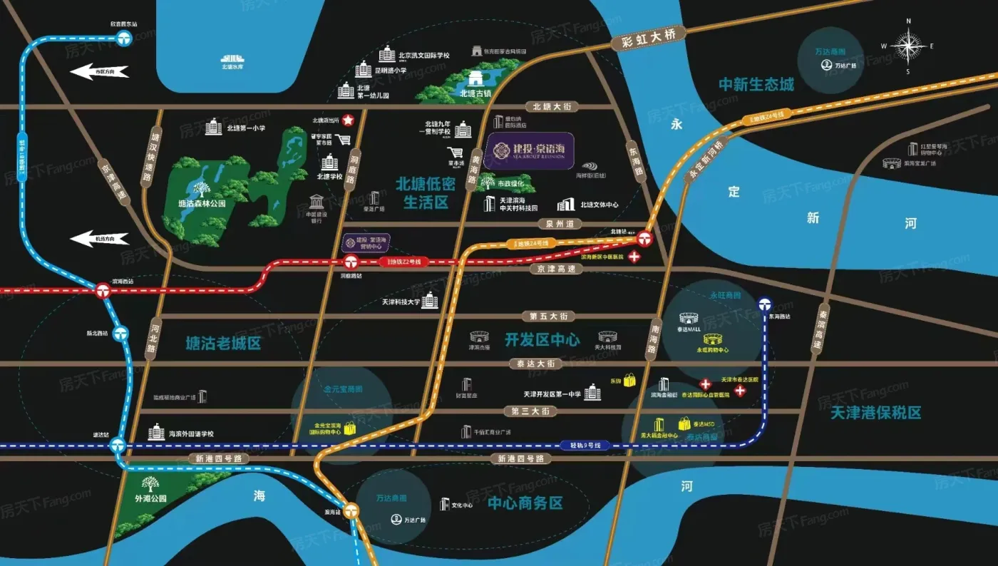 北塘位于天津滨海新区,板块内有11个在售楼盘,其中住宅楼盘11个,别墅3个,板块参考均价在13128元/㎡。