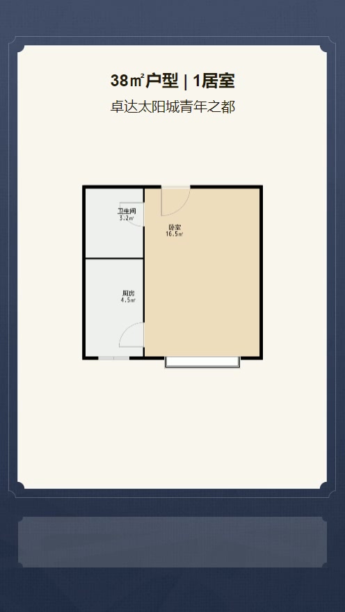 售完卓达太阳城青年之都1居室户型图 | 建面:38㎡ | 朝向:朝南