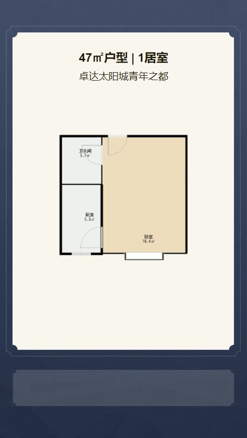 售完卓达太阳城青年之都1居室户型图 | 建面:47.03㎡ | 朝向:朝南