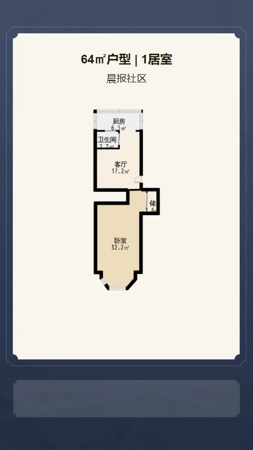 售完辽河街道晨报社区1居室户型图 | 建面:64㎡ | 朝向:南北通透