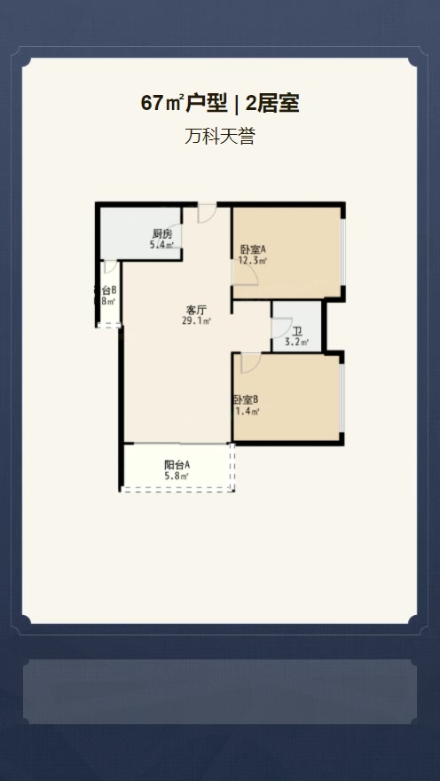 售完万科天誉2居室户型图 | 建面:67.95㎡ | 朝向:东南