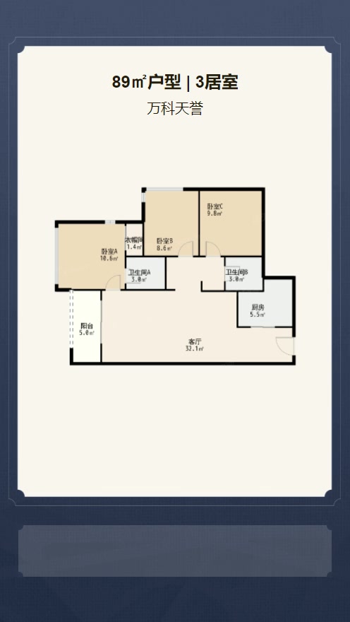 售完万科天誉3居室户型图 | 建面:89.51㎡ | 朝向:西南
