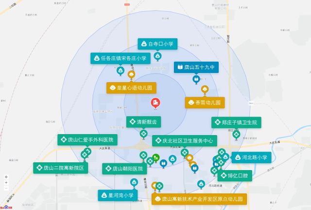 直线3km范围内有7个幼儿园。直线3km范围内有8个小学,如大庆九号小学、永庆道小学、任各庄镇宋各庄小学、白寺口小学、星河湾小学等。直线3km范围内有4个中学:唐山东方学校、唐山市第三十五中学、唐山五十九中、唐山英才学校(高新校区)。