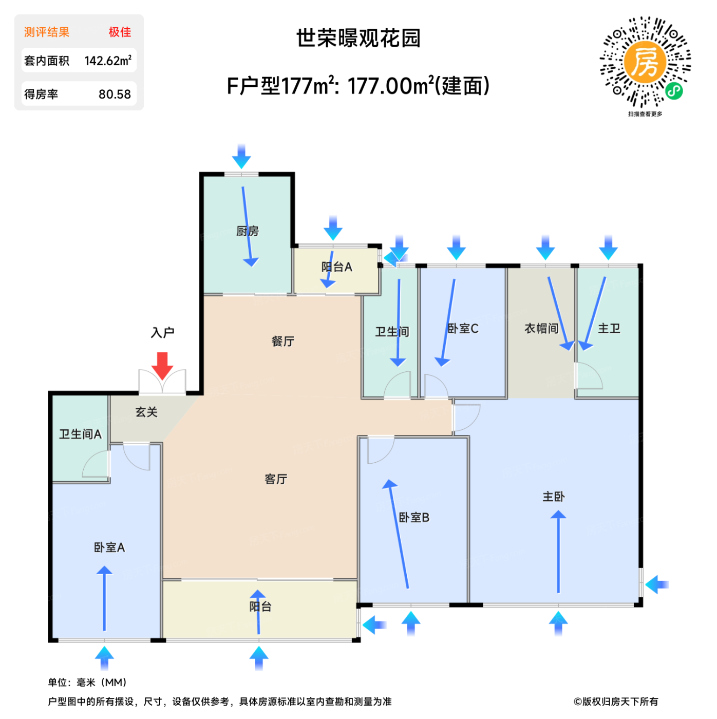 在售F户型177㎡ | 建面:177㎡ | 朝向:南,北,东