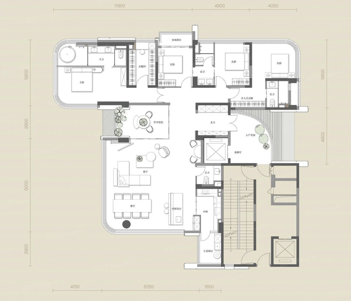仁和春天·29號院户型主要有200平-260平的南北通透,全明格局,户型方正,动静分离,高附赠空间,客厅朝南,卧室朝南的四居 。