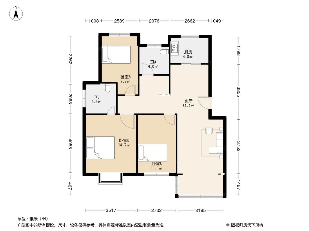 户型齐全,主打户型方正,明卫,明厨,双卧朝南,主卧朝南三居